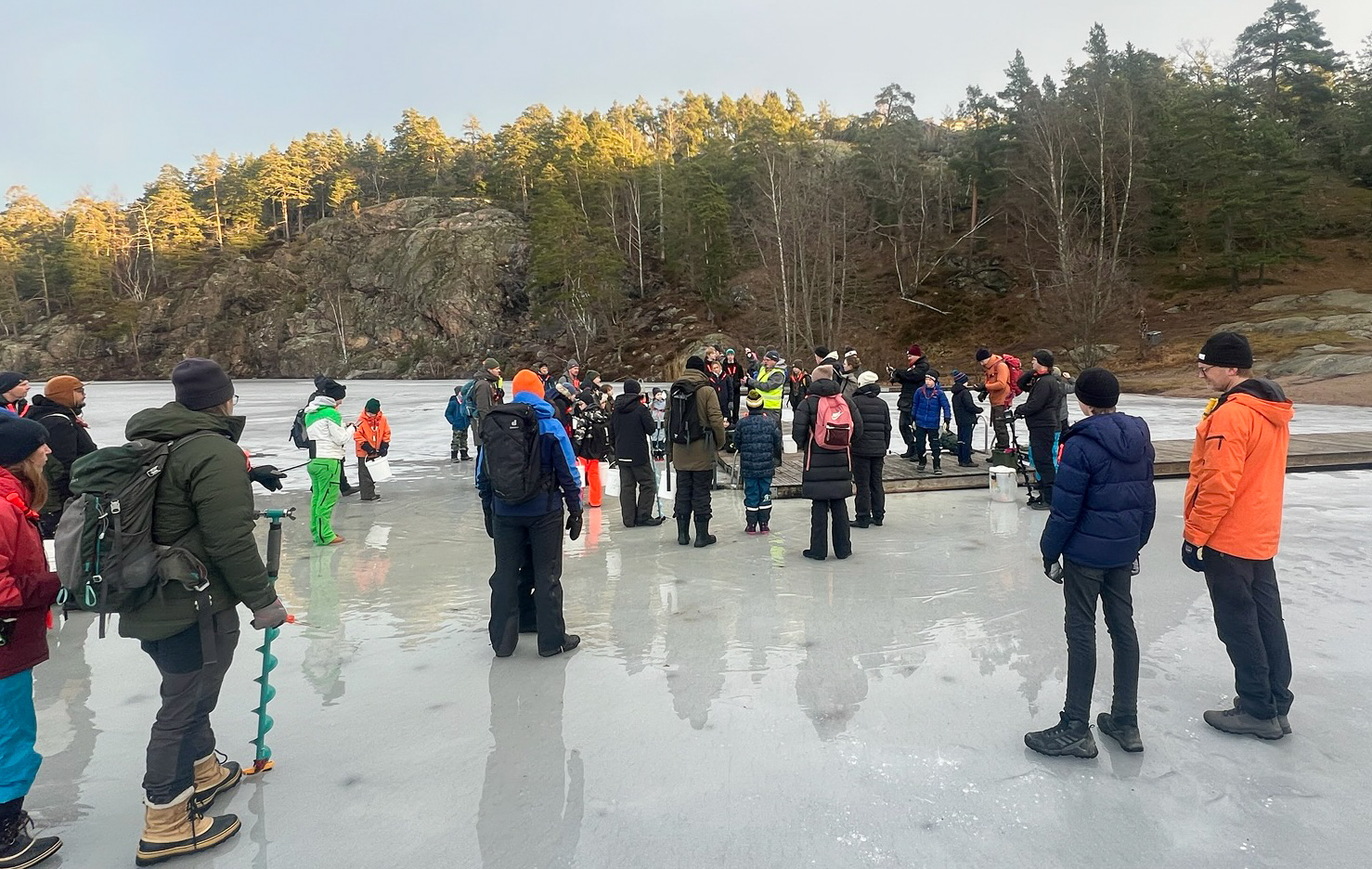 Vi fiskar på Oxundasjön med ismete och pimpelfiske. Fiskeskola i pimpel för alla som vill. Det finns spön mm att låna.